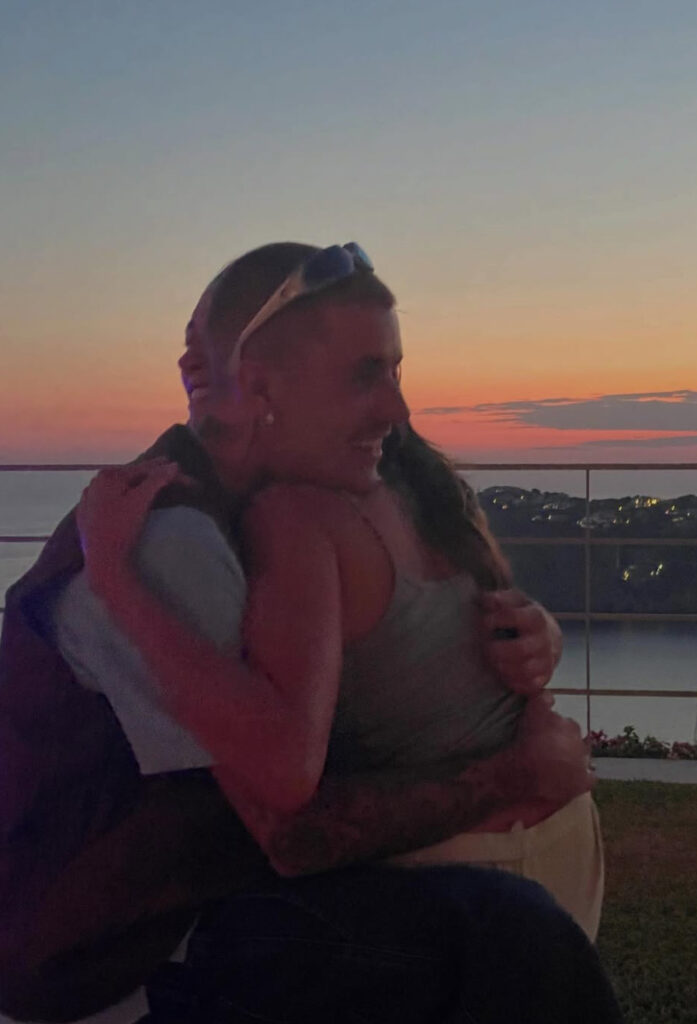 Postimi përmban katër foto të afërta ku Bieber shihet me krahët rreth një gruaje, teksa janë ulur në një stol duke parë perëndimin e diellit.