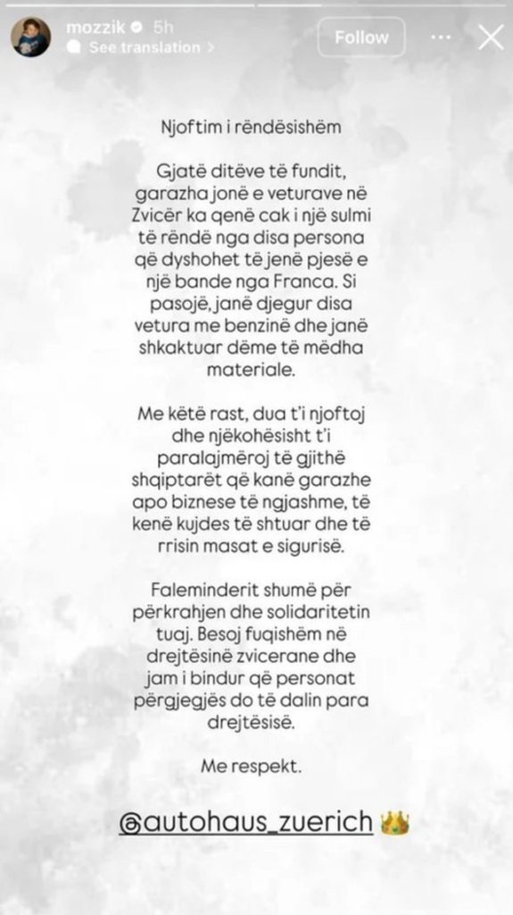 “Gjatë ditëve të fundit, garazha jonë e veturave në Zvicër ka qenë cak i një sulmi të rëndë nga disa persona që dyshohet të jenë pjesë e një bande nga Franca. Si pasojë, janë djegur disa vetura me benzinë dhe janë shkaktuar dëme të mëdha materiale”, shkruan ai.
