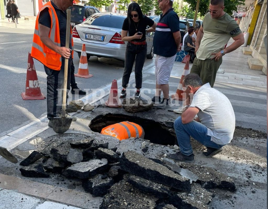 Siç duket dhe në foton e sjellë në redaksinë e “DurrësLajm“, është hapur një gropë e madhe në vizat e bardha të rrugës. Deri tani nuk janë të ditura arsyet se përse ka ndodhur.