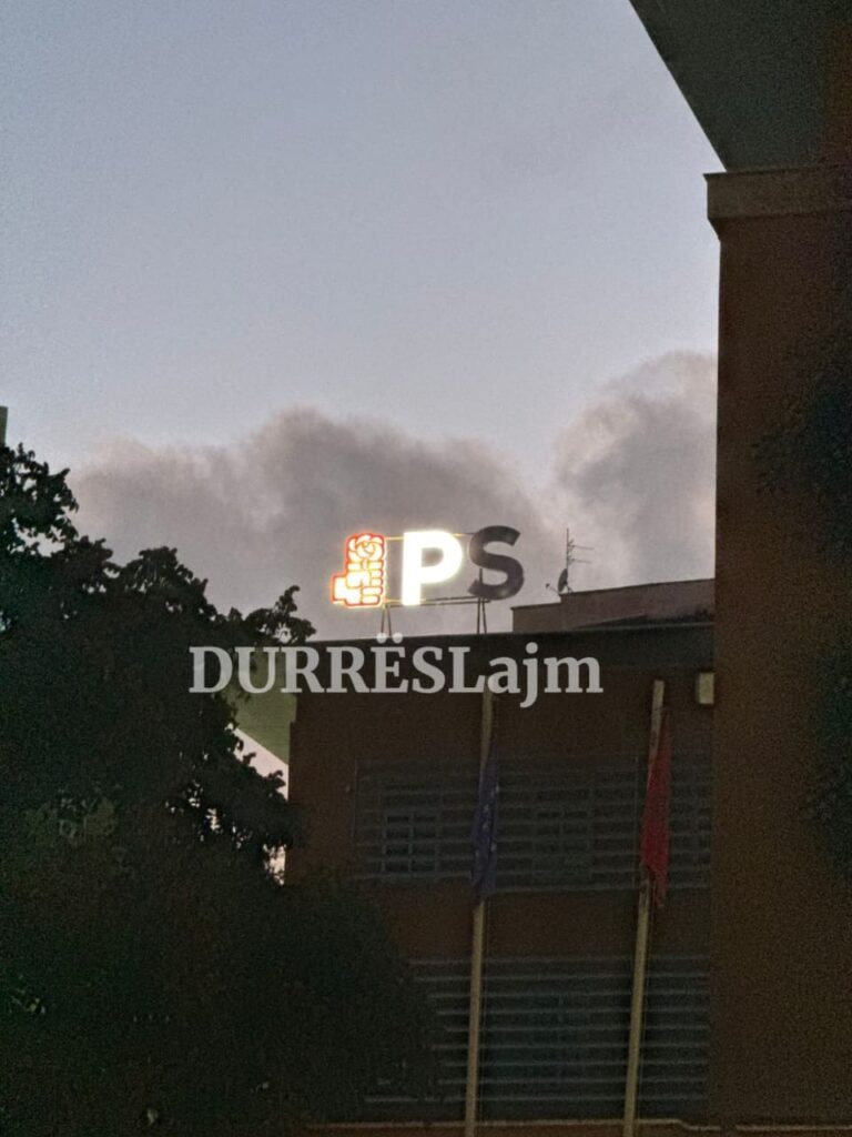 Mbrëmjen e sotme, logoja e PS mbi godinën e selisë lokale të degës së kësaj partie në Durrës ishte në këtë gjendje.
