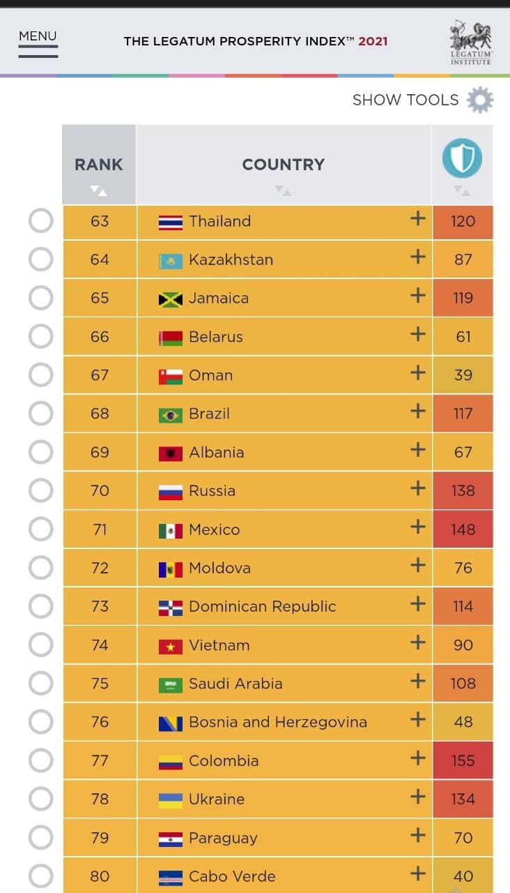 Sipas Indeksit të Prosperitetit, të përgatitur nga Legatum Institute, institucion i pavarur prestigjoz i përpunimit të statistikave që vijnë nga burime të besueshme, rezulton se vetëm brenda dy viteve të fundit Shqipëria ka përkeqësuar me tre shkallë treguesin e prosperitetit, duke rënë në vendin e 69-të për vitin 2021, nga vendi i 66-të, që ndodhej në 2019.