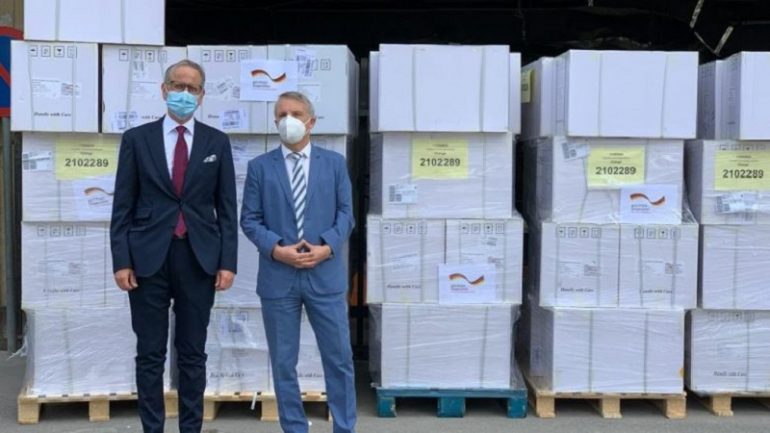 Gjermania sot dorëzoi 150 mijë teste për Covid 19 në mbështetje të Kosovës. Dërgesa e 150.000 testeve antigjen Rapid COVID-19 ka një vlerë mbi 600.000 euro. Ky donacion do t’i shërbejë sistemit shëndetësor në Kosovë për të luftuar përhapjen e Covid-19.