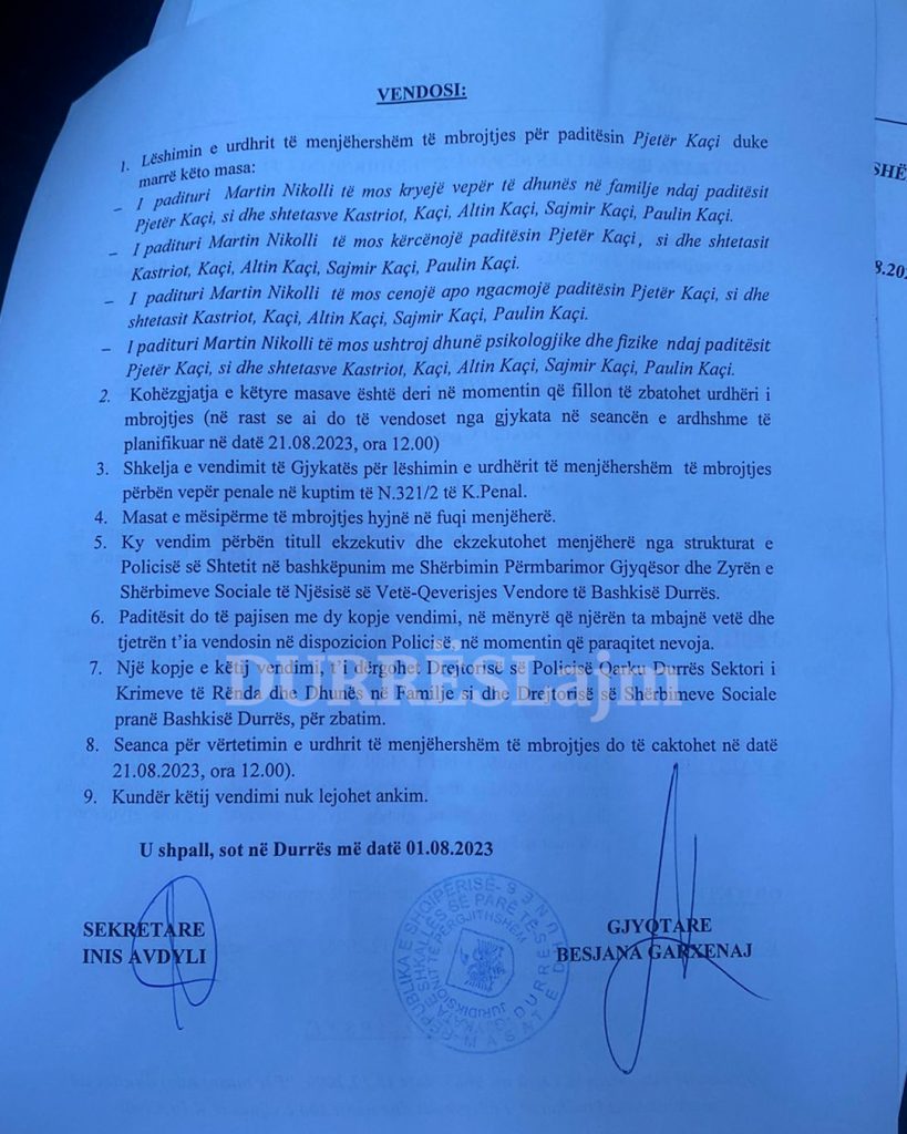 Një ditë më parë, gjykata e Durrësit lëshoi urdhër të menjëhershëm mbrojtjeje për Pjetër Kaçin dhe djemtë e tij, pas konfliktit që ata patën me gardistin Martin Nikolli dhe familjen e tij në Hamallaj.