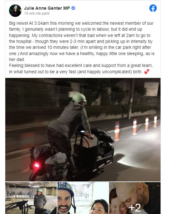 Mediat e huaja bëjnë me dije se deputetja, Julie Anne Genter, ka udhëtuar me biçikletë deri në spital, ku një orë më vonë solli në jetë fëmijën.