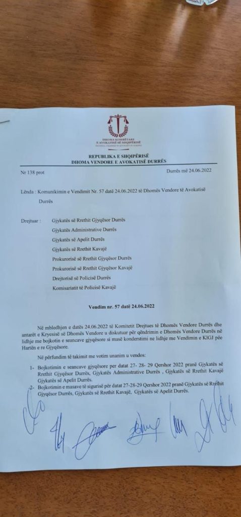 Dhoma e Avokatisë Vendore në Durrës ka vendosur ditën e sotme për bojkotimin e seancave në gjykata për datat 27, 28 dhe 29 qershor, në shenjë proteste për hartën e re gjyqësore.