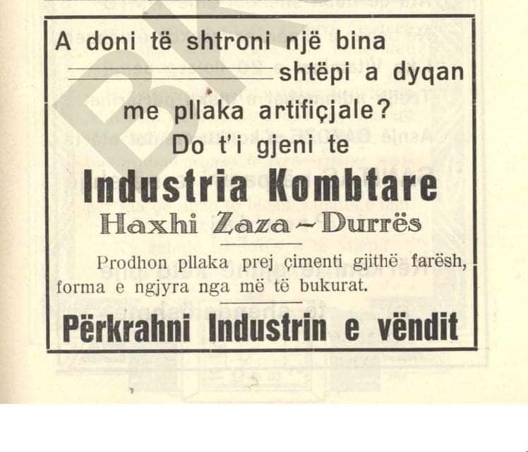 Kështu do e paraqisnin reklamën e biznesit të pllakave në Durrës tek gazetat, revistat e ndryshme në kohën e monarkisë Shqiptare 1928-1939. Dukej qartë që industria vendase kishte hyrë në shinat e duhura në atë periudhë duke pasur parasysh mundësinë e tregtisë në një qytet si Durrësi i cili ishte gjithmonë në zhvillim e sipër. Kjo reklamë i përket vitit 1933, e cila ishte pronë e familjes Zaza në Durrës, dhe konkretisht vëllezërve Haxhi dhe Ramazan Zaza të cilët zotëronin një punishte ku prodhonin pllaka me dimensione të ndryshme dhe zbukurime me lule të cilat për kohën ishin tërheqëse.
