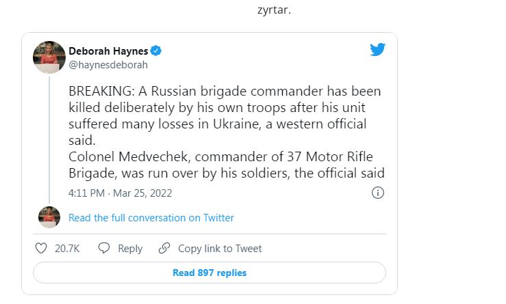 “Komandanti i brigadës u vra nga trupat e tij. Besojmë, si pasojë e shkallës së humbjeve që janë marrë nga brigada e tij. Ne besojmë se ai u vra nga trupat e tij qëllimisht.”-tha një zyrtar.