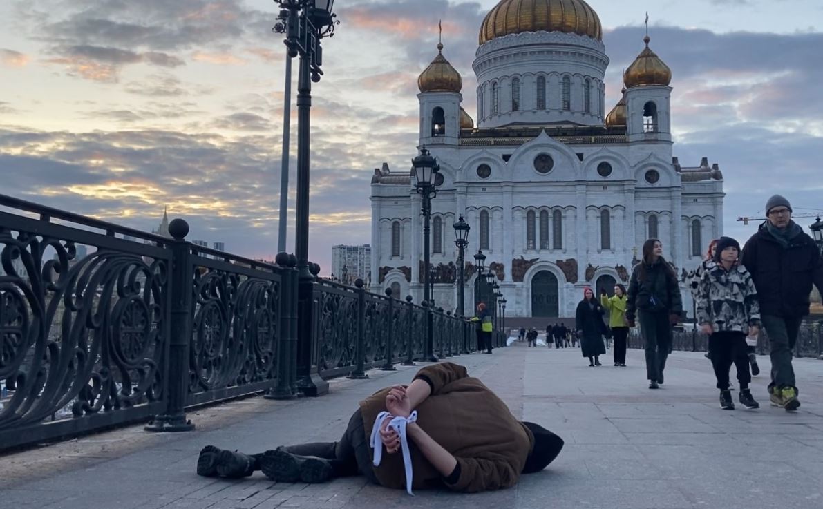 Një protestues në Moskë është fotografuar i shtrirë me fytyrë përtokë dhe me duart e lidhura mbrapa në shenjë nderimi të mënyrës sesi trupat e disa ukrainasve janë gjetur të pajetë në rrugët e qytezës së Buchas, afër Kievit.