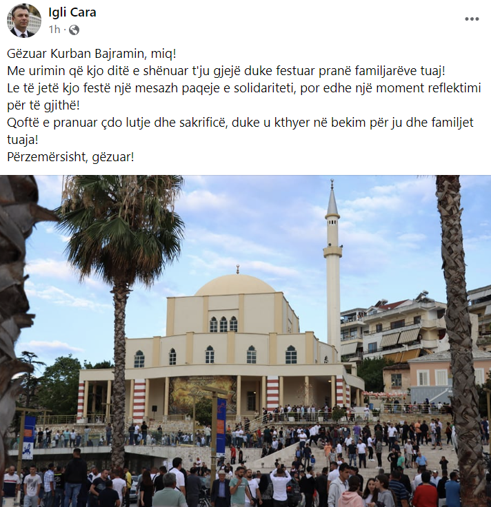 Kreu i degës lokale të PD Durrës, Igli Cara i ka shprehur urimet besimtarëve myslimanë për Kurban Bajramin.