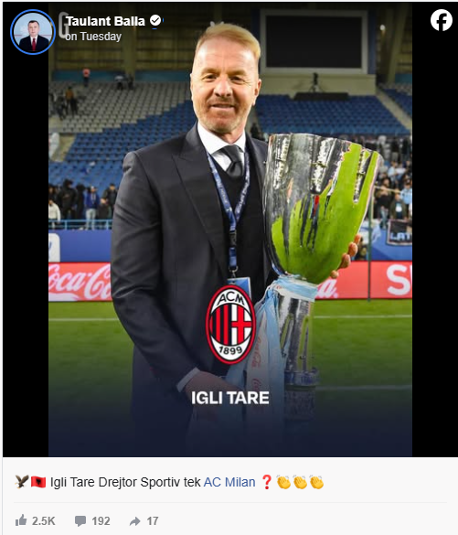 Me anë të një postimi në rrjetet sociale, Balla nuk kursen duartrokitjet për Igli Taren. Duket se emërimi dhe zyrtarizimi i Milanit për Igli Taren mezi pritet edhe nga pjesa e tjetër e shqiptarëve. Kësaj pritje i është bashkuar edhe ministri, Balla.