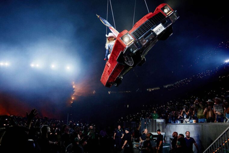Një moment i frikshëm ndodhi gjatë koncertit të Beyoncé në Houston, kur një makinë kabriolet pezull mbi skenë, pjesë e performancës së saj spektakolare, nisi të anohej në mënyrë të rrezikshme mbi publik.