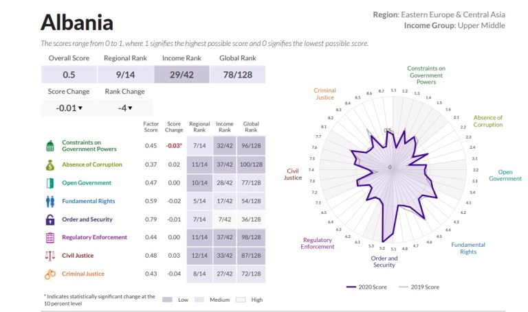 Në indeksin global të vitit 2020 që përfshiu 128 vende, Shqipëria u rendit në vendin e 78, për cilësinë e funksionimit të drejtësisë duke u përkeqësuar në renditje me 4 vende në raport me vitin 2019.