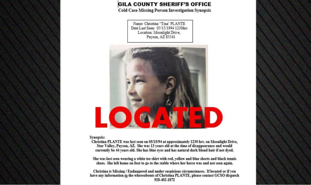 Një 45-vjeçare që ishte zhdukur në Arizona, kur ishte vetëm 13-vjeçe është gjetur pas 32 vitesh. Christina Marie Plant ishte parë për herë të fundit në Star Valley, në verilindje të Phoenix, më 16 maj 1994.