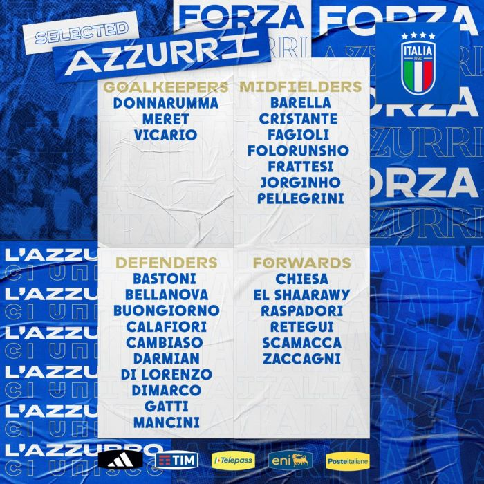 Lista përfundimtare është me 26 lojtarë. Provedel, Ricci dhe Orsolini janë lënë jashtë nga Spalleyti, ndërsa Acerbi apo Scalvini janë detyruar të lënë grumbullimin për shkak dëmtimeve.