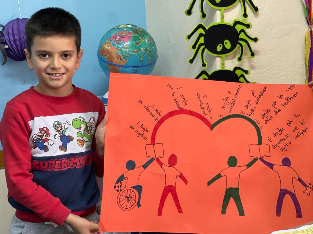 Me doçkat e tyre të vogla, me ndihmën e mësueses së tyre Romina Kasembi, por edhe prindërve, vogëlushët kanë punuar ditët e fundit për realizimin e fjongove blu, por edhe vizatimeve apo punimeve të ndryshme që si tematikë të tyre kanë të drejtat e fëmijëve.
