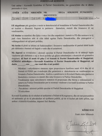 Aktori i humorit Julian Deda, i cili është edhe një anëtar i Partisë Demokratike, sot ka firmosur formularin ku kërkohet mbledhja e Këshillit Kombëtar të PD.
