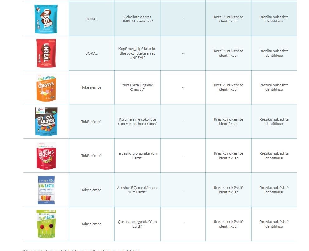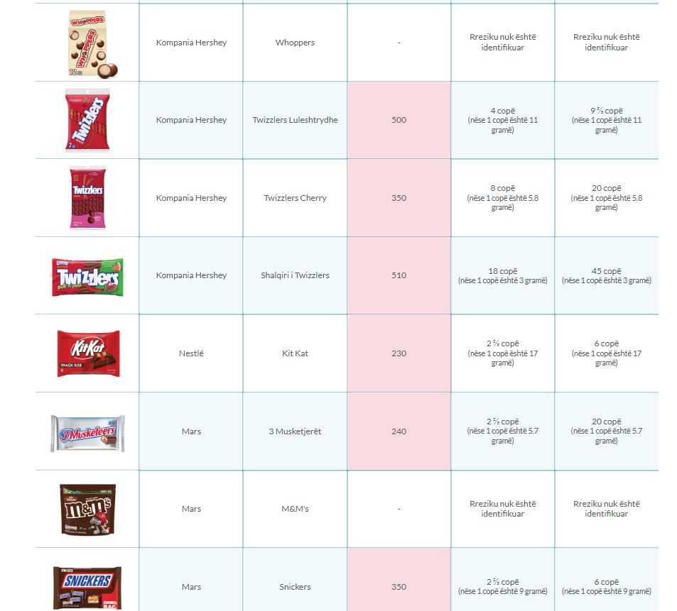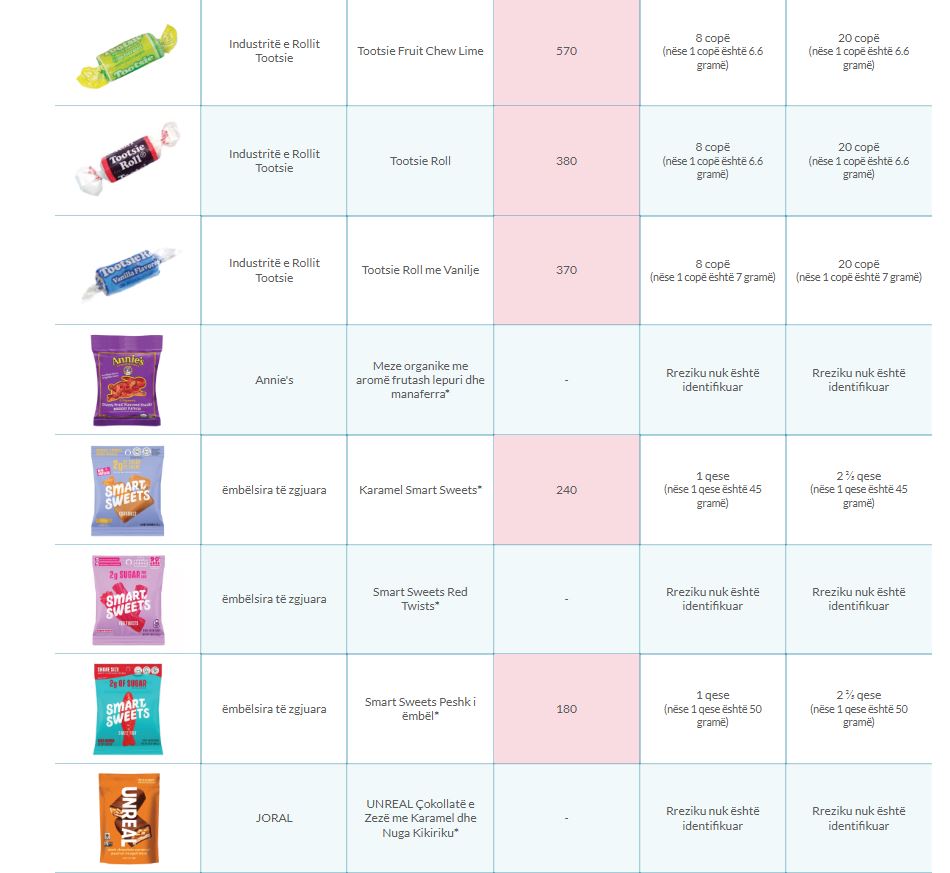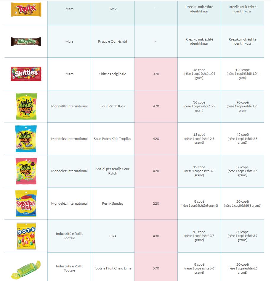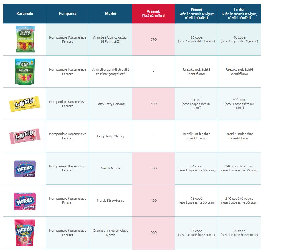 Në studim, disa nga ëmbëlsirat e preferuara që rezultuan të pre3kura nga nivele jo normale arseniku, ishin përfshirë Kit Kat, Snickers, Original Skittles, Swedish Fish, Sour Patch Kids, Tootsie Roll.