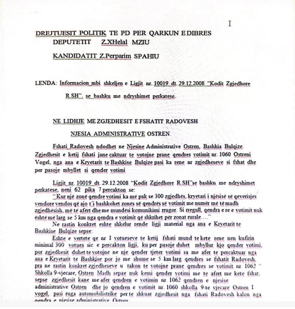 Sipas Spahiut, edhe pse është e ligjshme mbyllja e një qendre votimi nëse numri i votuesve bie nën 300, ligji nr. 10019, neni 62 pika 7 i Kodit Zgjedhor përcakton qartë se në këto raste zgjedhësit duhet të transferohen në një qendër votimi tjetër jo më larg se 5 kilometra dhe që të ketë mundësi komunikimi rrugor. Në rastin konkret sipas tij, kjo nuk është respektuar.