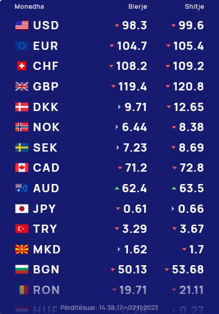 Euro do blihet me 104.7 lekë dhe do shitet me 105.4 lekë, ndërsa franga zvicerane do blihet me 108.2 lekë dhe do shitet me 109.2 lekë.