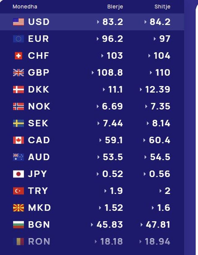 Për kursin e monedhave të tjera shihni tabelën e mëposhtme: