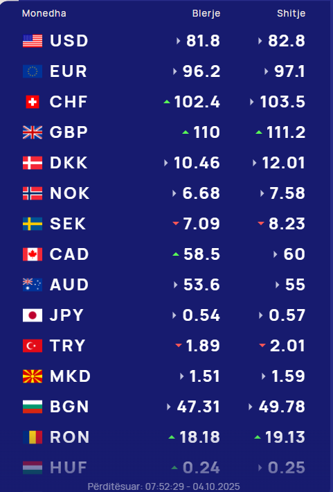 Për sa i përket frangës zvicerane, ajo këmbehet me 102.4 lekë në blerje dhe 103.5 lekë në shitje. Ndërsa paundi britanik sot blihet me 110 lekë dhe shitet me 111.2 lekë.
