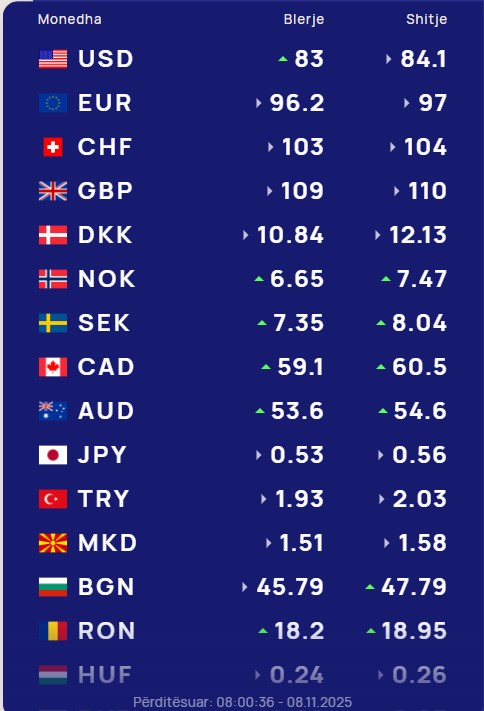 Ndërsa paundi britanik do blihet me 109 lekë dhe do shitet me 110 lekë.