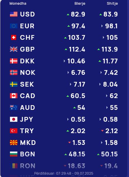 Ndërkohë monedha evropiane euro do blihet me 97.4 lekë dhe do shitet me 98.1 lekë.