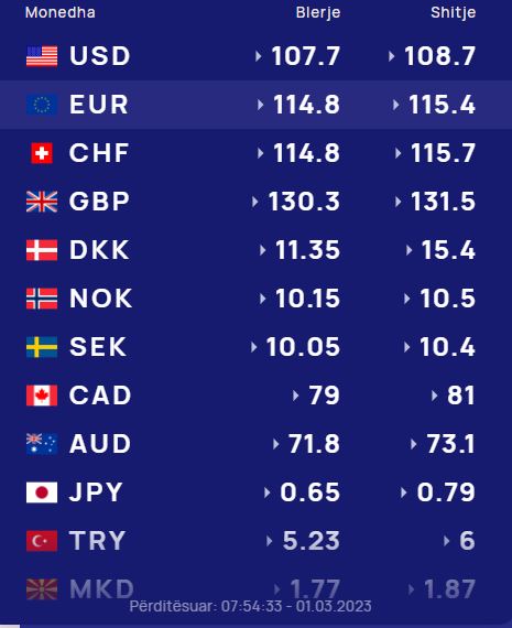 Euro sot do të blihet me 114.8 lekë dhe do të shitet me 115.4 lekë. Ndërsa franga zvicerane do të blihet me 114.8 lekë dhe do të shitet me 115.7 lekë.