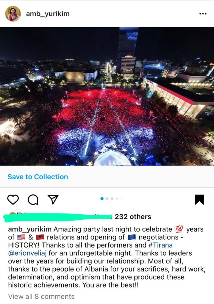Ambasadorja amerikane Yuri Kim ka reaguar me një postim në Instagram pas koncertit të organizuar për të festuar 100-vjetorin e marrëdhënieve SHBA-Shqipëri dhe hapjes së negociatave me BE-në.