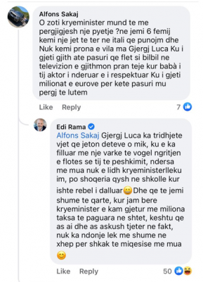 Komentuesi: O Zoti kryeministër mund të më përgjigjesh një pyetje? Ne jemi 6 fëmijë kemi një jetë të tërë në Itali dhe punojmë e nuk kemi prona e vila ma Gjergj Luca, ku i gjeti gjithë ato pasuri që flet si bilbil në televizion e gjithëmonë pranë teje kur baba i tij aktor i nderuar e i respektuar, ku i gjeti milionat e eurove për këtë pasuri?