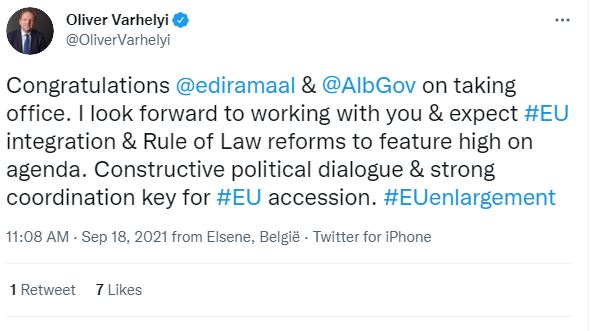 “Urime Edi Rama dhe qeveria e Shqipërisë në marrjen e detyrës. Pres me padurim të punoj me ju dhe pres që integrimet #EU dhe sundimi i ligjit të shfaqen në rendin e ditës. Dialogu konstruktiv politik është çelës i fortë koordinimi për në Bashkimin Europian”– shkruan Varhelyi.