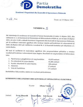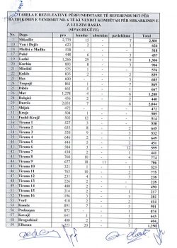 Komisioni i Organizimit dhe Operacioneve Elektorale ka publikuar rezultatet e verifikimit te materialeve zgjedhore dhe miratimin e rezultatit përfundimtar të votimit në Referendumin për ratifikimin e vendimit Nr. 6 të Kuvendit Kombëtar për shkarkimin e kreut të Partisë Demokratike Lulzim Basha.