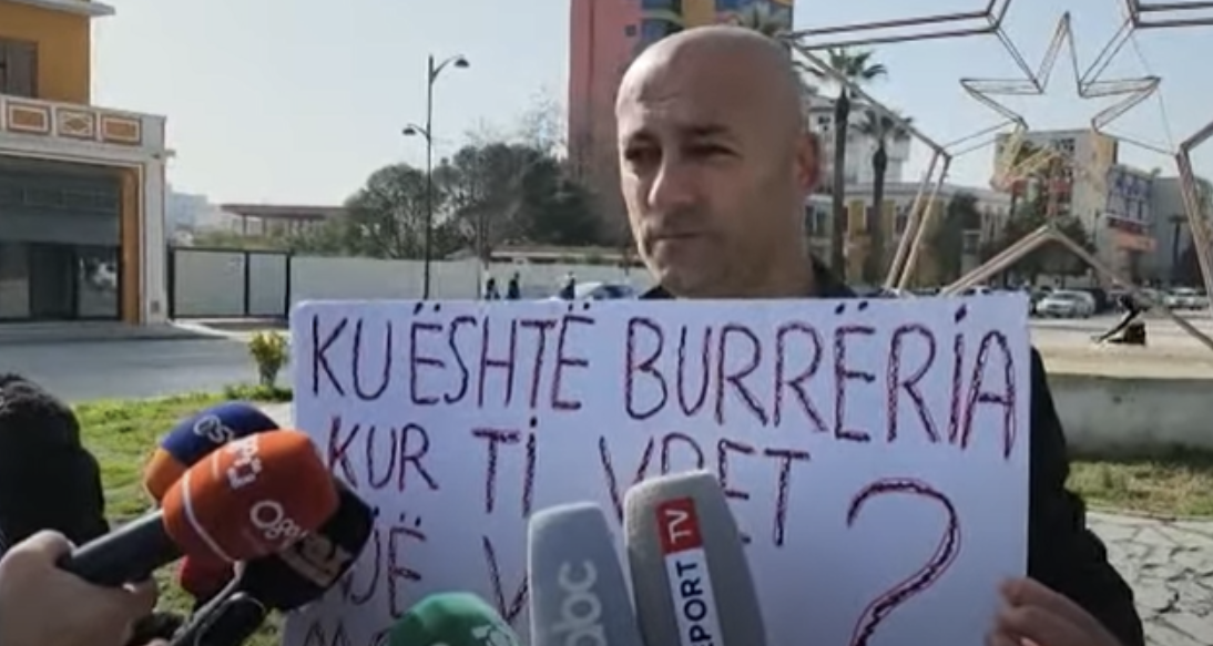 Me pankartën “Ku është burrëria kur ti vret një vajzë, motër, nënë?”, Edmond Hoxha tergon indinjatën e tij në lidhje me vrasjen e trefishtë, ndërsa bën thirrje që shteti të marrë masa për parandalimin e vrasjeve të grave.