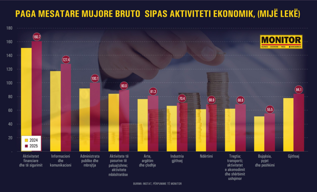 Sipas aktiviteteve ekonomike, aktivitetet financiare dhe të sigurimit vijojnë të mbeten sektori më i paguar në vend. Në vitin 2025, paga mesatare në këtë sektor arriti një rekord prej 161 mijë lekësh në muaj, me një rritje prej 6.3% krahasuar me një vit më parë.