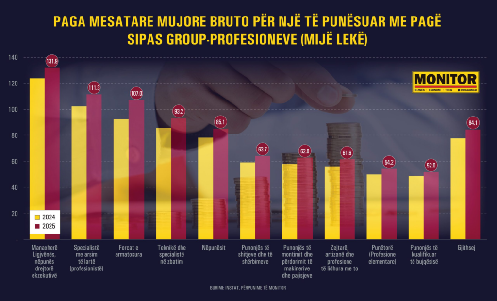 Sipas grup-profesioneve, më të mirëpaguarit vijojnë të jenë menaxherët, ligjvënësit, nëpunësit e lartë dhe drejtorët ekzekutivë, me një pagë mesatare prej 132 mijë lekësh në muaj në vitin 2025, ose 6.7% më shumë se një vit më parë.