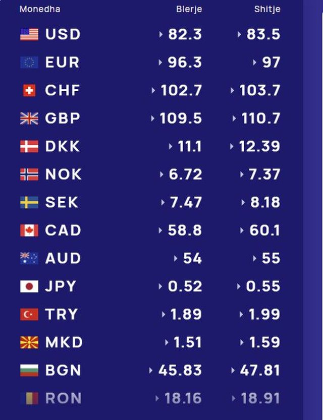 Ndërsa paundi britanik blihet me 109.5 lekë dhe shitet me 110.7 lekë.