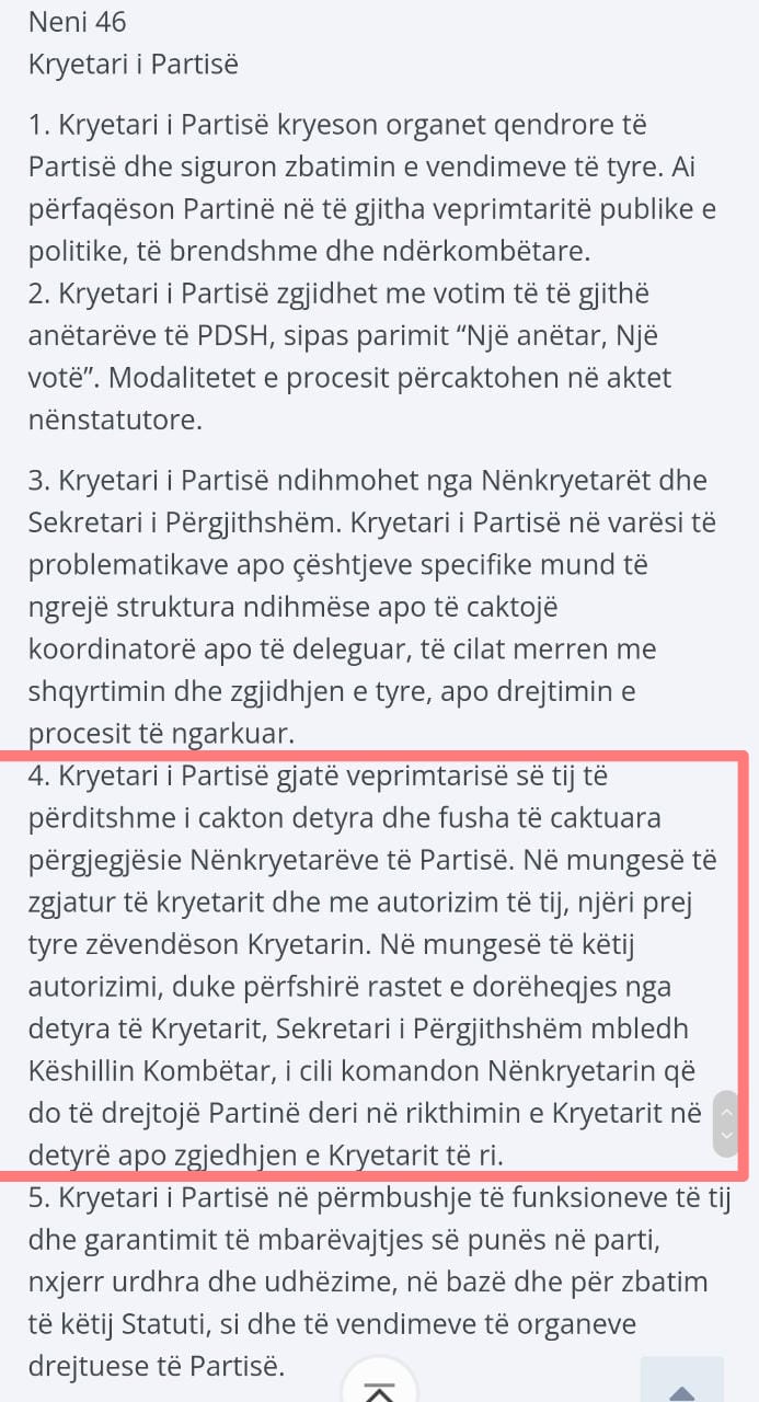 Sipas nenit 46 të statutit të partisë drejtimin e partisë deri në zgjedhjen e kryetarit te ri e merr njëri nga nënkryetarët.