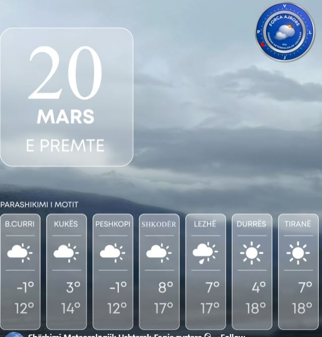 Moti parashikohet me kthjellime si dhe alternime vranësirash të cilat hera-herës priten të jenë deri mesatare, këto të fundit kryesisht pas orëve të mesditës në relievet malore.