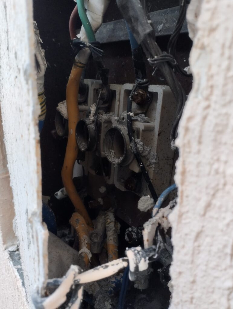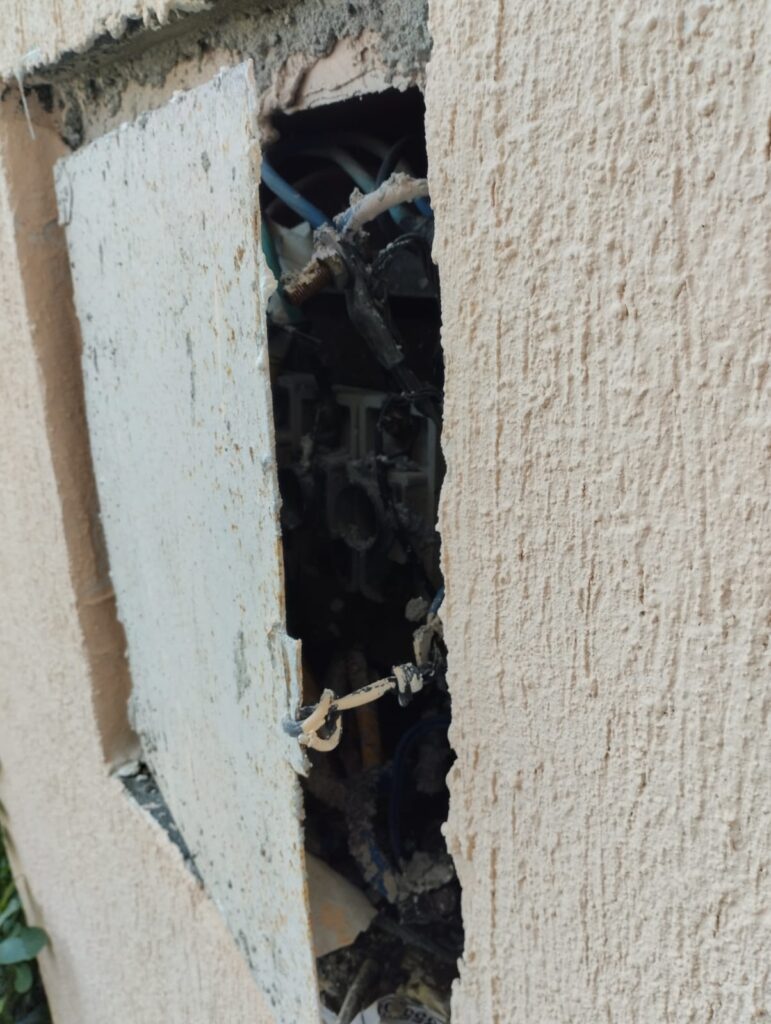 “Ka shumë rrezik, shihni si është kutia e hapur, ndërkohë tek muri ka shumë lagështirë. Dje na u përmbyt edhe hyrja e pallatit nga shiu. Ende ka ujë sot. Të vijnë ta rregullojnë se po na bëhet ndonjë hata”,- shkruan banori.