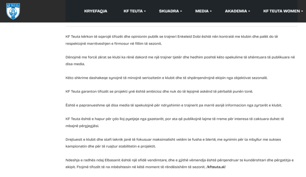 KF Teuta kërkon të sqarojë tifozët dhe opinionin publik se trajneri Enkeleid Dobi është nën kontratë me klubin dhe palët do të respektojnë marrëveshjen e firmosur në fillim të sezonit.