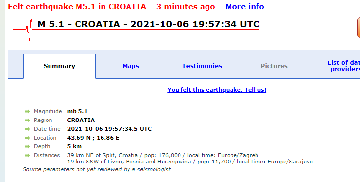 Një tërmet me magnitudë 5.1 tronditi Dalmacinë pak para orës 10 të mbrëmjes.