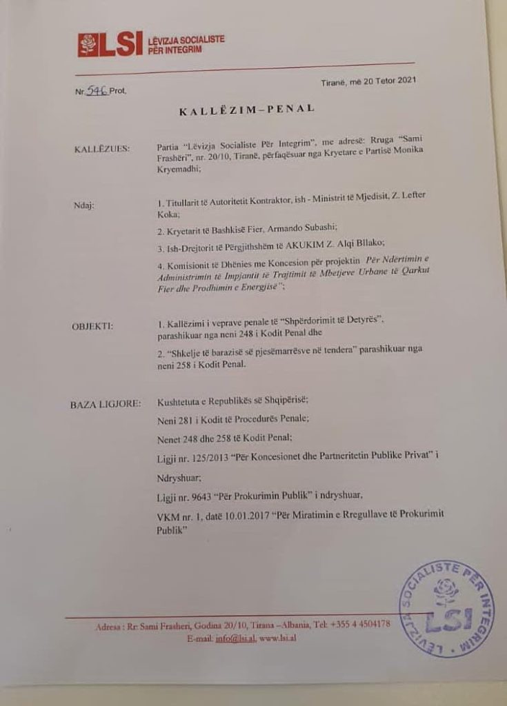 Sipas LSI-së, ish-ministri i Mjedisit Lefter Koka, ish-sekretari i Përgjithshëm i kësaj ministrie sot deputet i Partisë Socialiste, Alqi Bllako, dhe kryetari i Bashkisë së Fierit Armando Subashi, kanë kryer dy vepra penale atë të “Shkeljes së barazisë në tendera” dhe “Shpërdorimin e  Detyrës”.