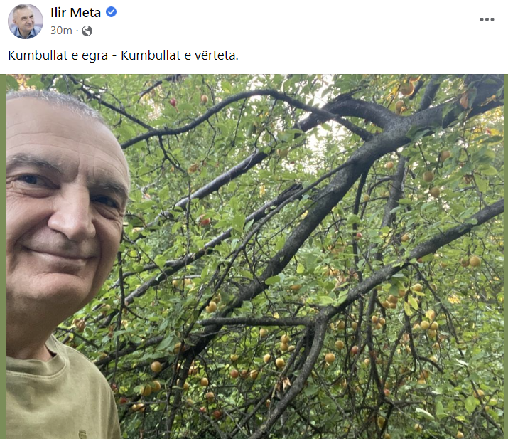 Presidenti Ilir Meta ka publikuar në Facebook një foto nën degët e kumbullave.