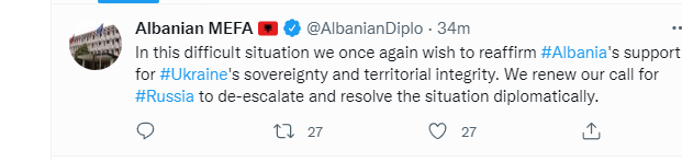 “Në këtë situatë të vështirë dëshirojmë të rikonfirmojmë edhe një herë mbështetjen e Shqipërisë ndaj sovranitetit dhe integritetit territorial të Ukrainës. Ne ripërsërisim thirrjen tonë që Rusia të de-përshkallëzojë dhe të zgjidhë situatën në mënyrë diplomatike”, shkruan Ministria për Europën dhe Punët e Jashtme.