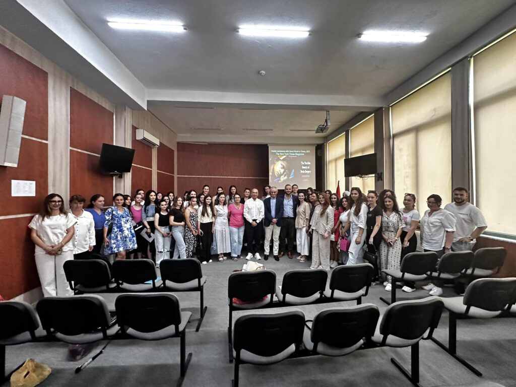 Dekani i Fakultetit të Studimeve Profesionale, Prof. Dr. Osman Metalla, së bashku me studentët dhe pedagogët e shkencave teknike mjekësore, ndoqën me interes mjaft të madh ligjëratën mbresëlënëse të profesor Petrelës, përmes së cilës përcolli mesazhe mjaft motivuese dhe inkurajuese për studentët por dhe stafin tonë.