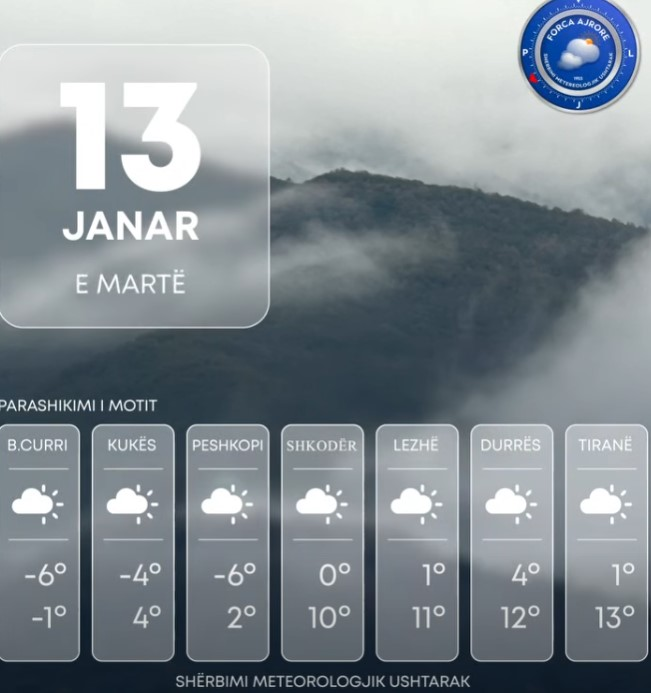 Ditën e sotme vendi ynë do të ndikohet nga kushte atmosferike të qëndrueshme. Moti parashikohet alternime kthjellimesh e vranësirash mesatare hera – herës deri të dendura.