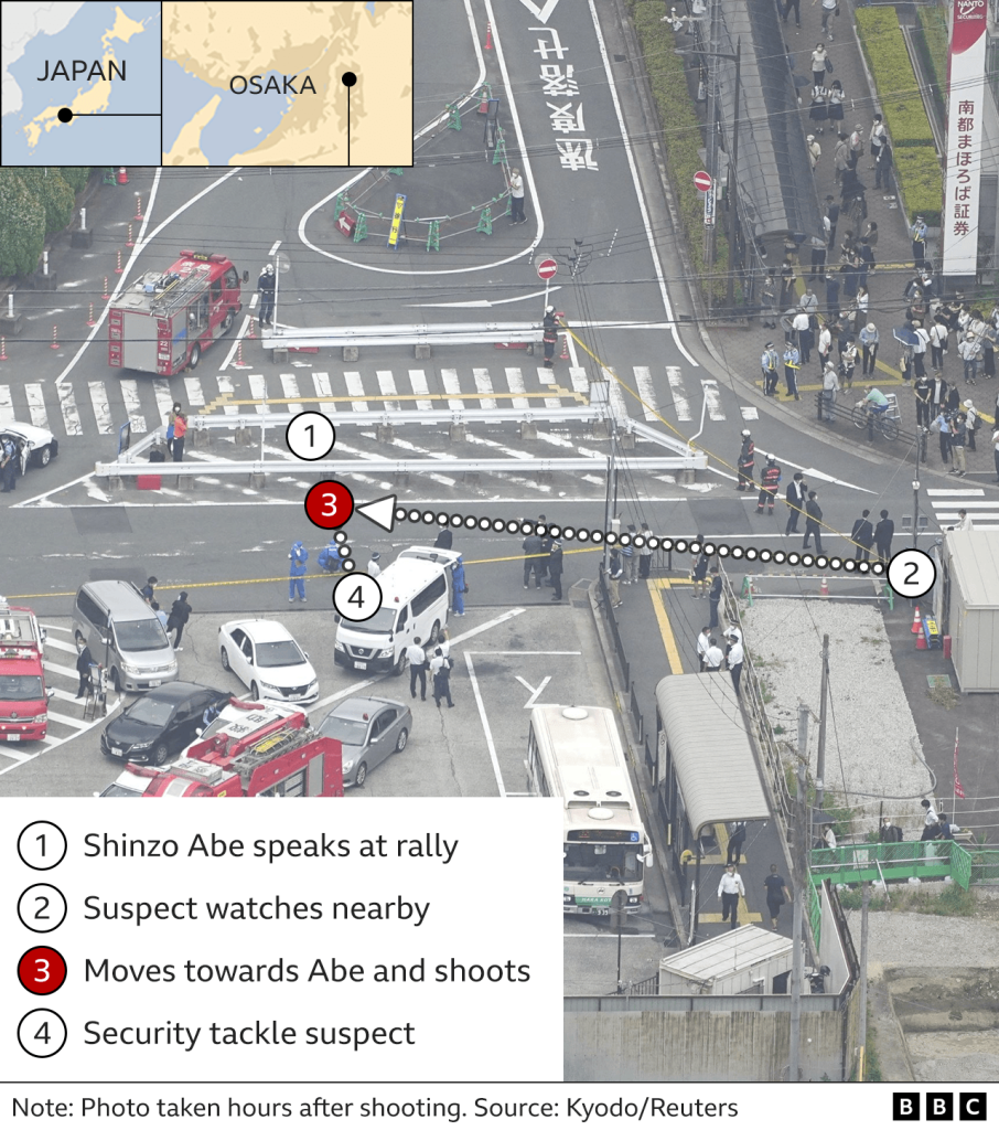 Pas të shtënës së parë, Abe i cili po fliste, kthehet për të parë dhe në atë moment është qëlluar për herë të dytë, ku më pas ish-kryeministri ka rënë në tokë.