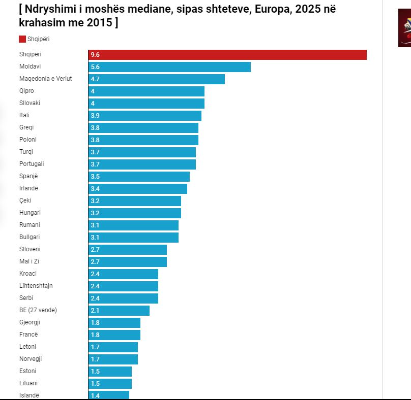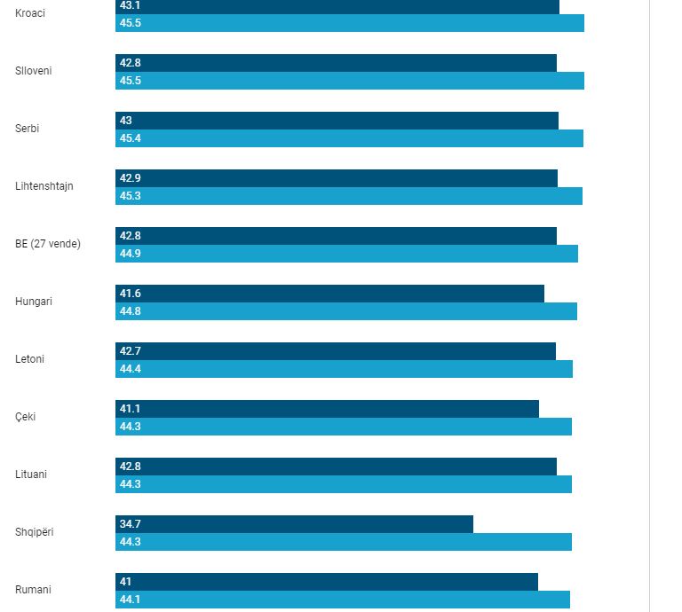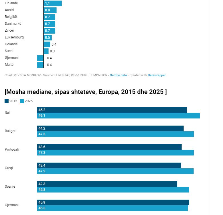 Edhe më alarmant është fakti se Shqipëria rezulton tashmë më e plakur se fqinjët e saj të afërt në Ballkanin Perëndimor; ndërsa Shqipëria shënon 44.3 vjeç, Maqedonia e Veriut mbetet në kufijtë e 42.1 viteve dhe Mali i Zi në 40.4 vjeç.