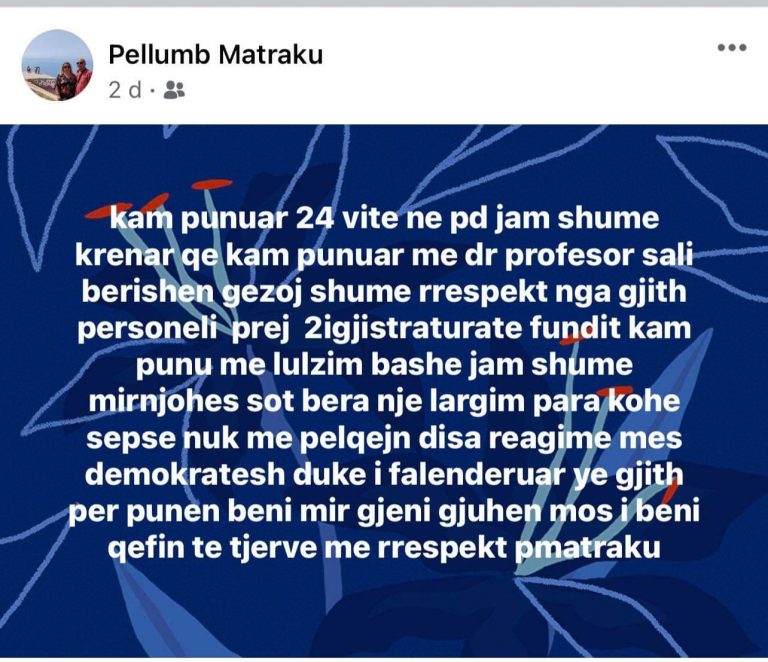 “Kam punuar 24 vite në PD. Jam shumë krenar që kam punuar me profesor doktor Sali Berishën. Në 2 legjislaturat e fundit kam punuar me Lulzim Bashën, i jam shumë mirënjohës. Sot (të mërkurën) bëra një largim para kohe sepse nuk më pëlqejnë disa reagime mes demokratësh. Bëni mirë të gjeni gjuhën, mos i bëni qejfin të tjerëve”, shkruan Matraku në “Facebook”.