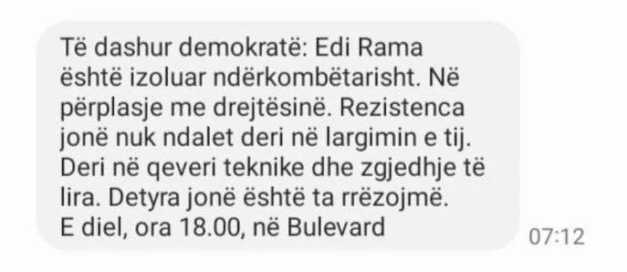 “Të dashur demokratë: Edi Rama është izoluar ndërkombëtarisht. Në përplasje me drejtësinë. Rezistenca jonë nuk ndalet deri në largimin e tij. Deri në qeveri teknike dhe zgjedhje të lira. Detyra jonë është ta rrëzojmë.